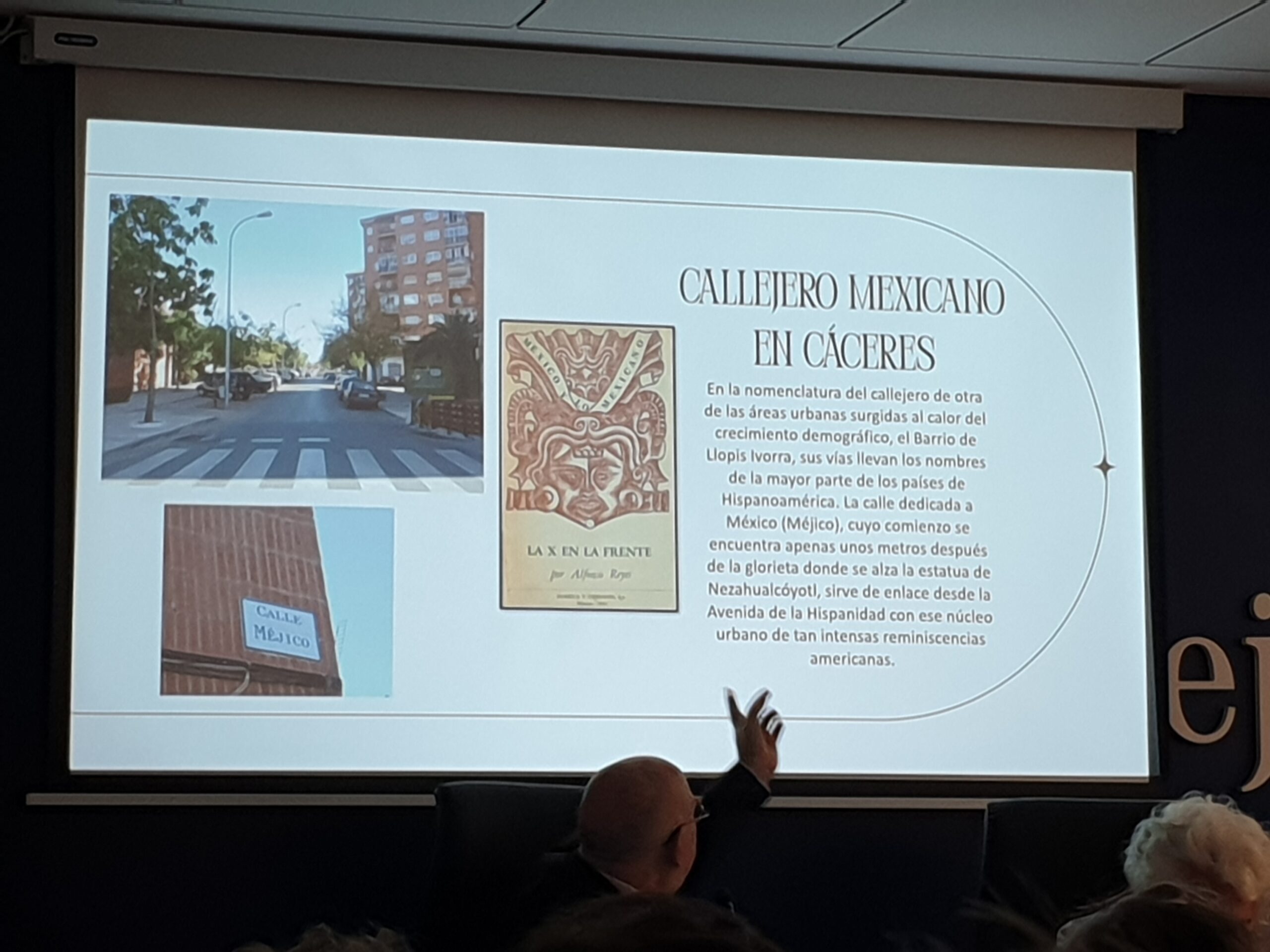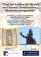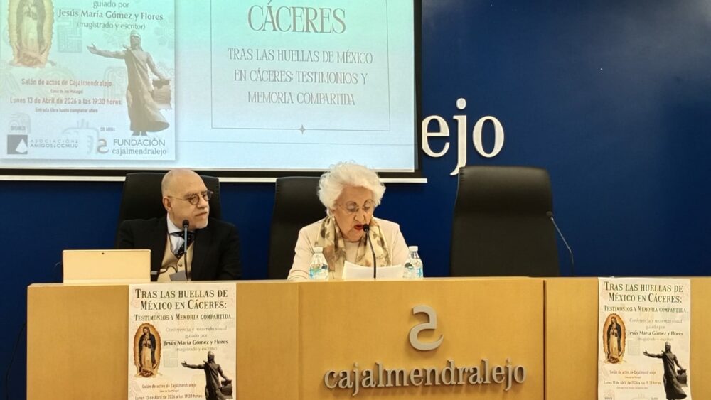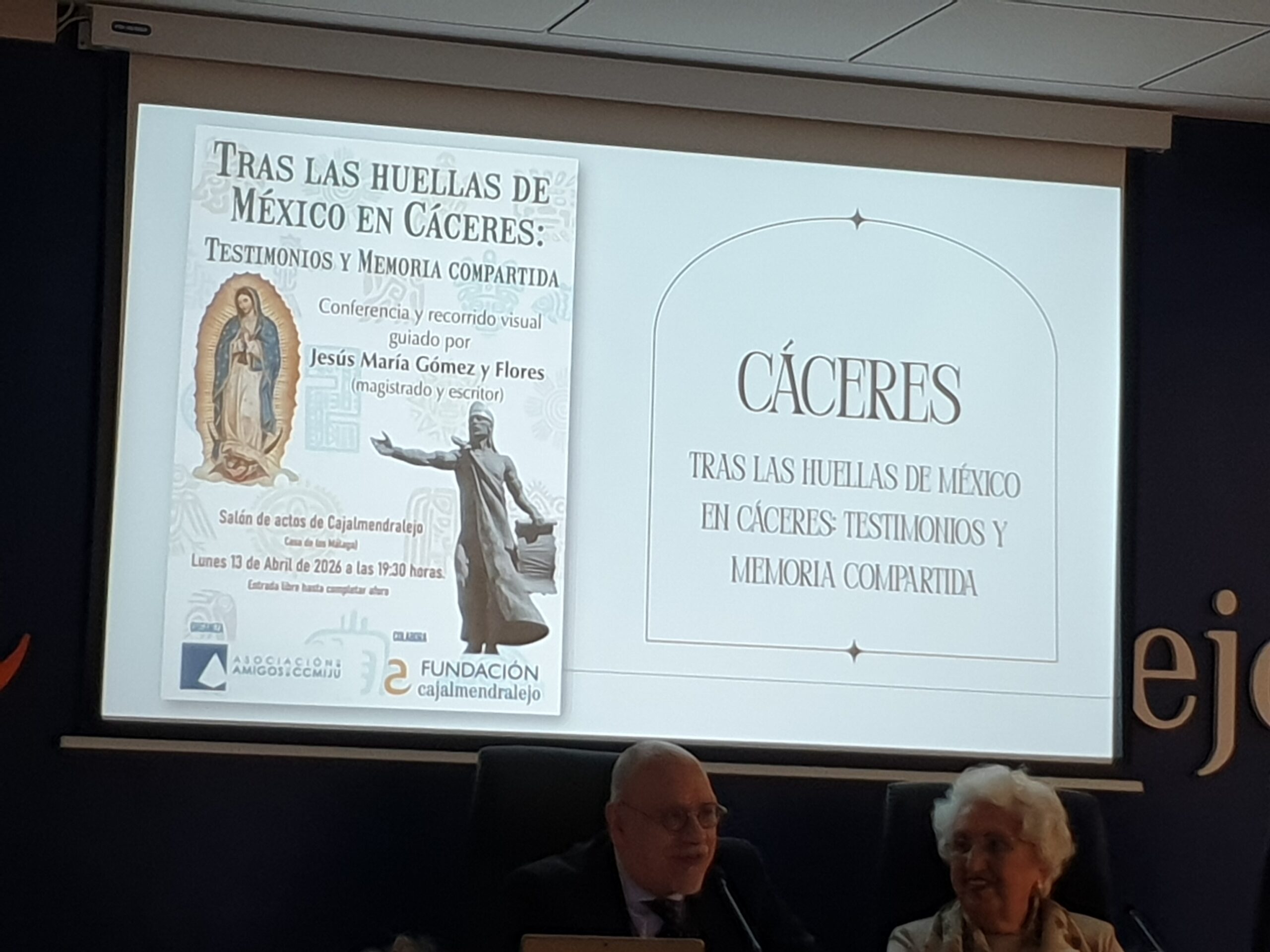 El lunes, día 13 de abril de 2026, D. Jesús María Gómez y Flores, a propuesta de la Asociación de ASCEMI, imparte una conferencia en el Salón de Caja Almendralejo de Cáceres, titulada «Tras la huella de México en Cáceres». El ponente demostra una preparación extraordinaria de este tema monográfico, muy documentado por sus múltiples lecturas como lo manifiesta citando trabajos de otros autores y sus fotografías de Cáceres relacionadas con México.